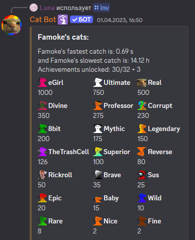 On the day that Cat Bot hit 10,000 servers (November 19th, 2023), it was also Lia's birthday. Therefore a special event occured where the Fine, Nice, and Good cat's spawn chance was all set to 1 (twice as rare as eGirl is usually). This allowed rarer cats to spawn much more often. The event only lasted one day. This also temporarily changed cat's trade values because of how the calculation for value works.
