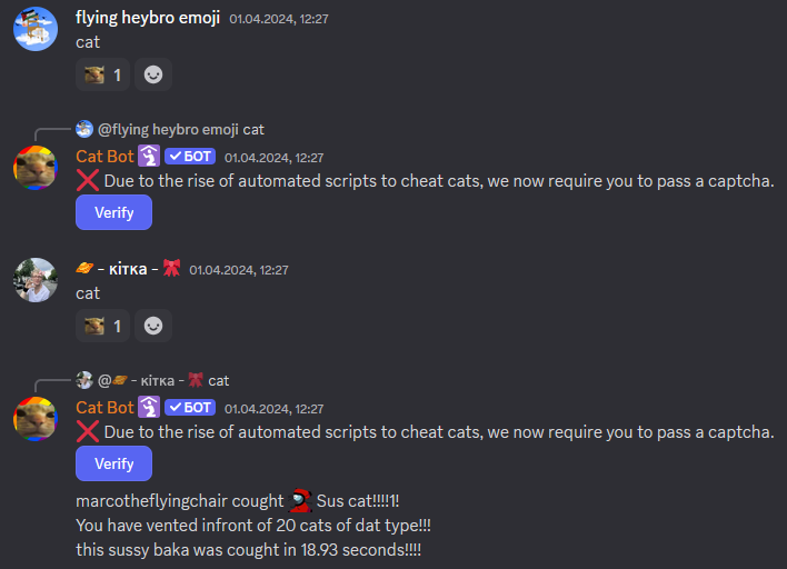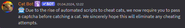 During this April Fools, you were required to pass a CAPTCHA before catching a cat. This was done by redirecting users to a website with a reCAPTCHA which caught the cat upon completion. There was a bug which allowed you to catch cats in any channel (including private ones) and as any user by modifying the website link. This resulted in some users in Cat Stand getting absurdly big "slow catch" times by catching old cats from testing channels and users who never joined the server (example: notexttospeech) getting credit for catching cats.