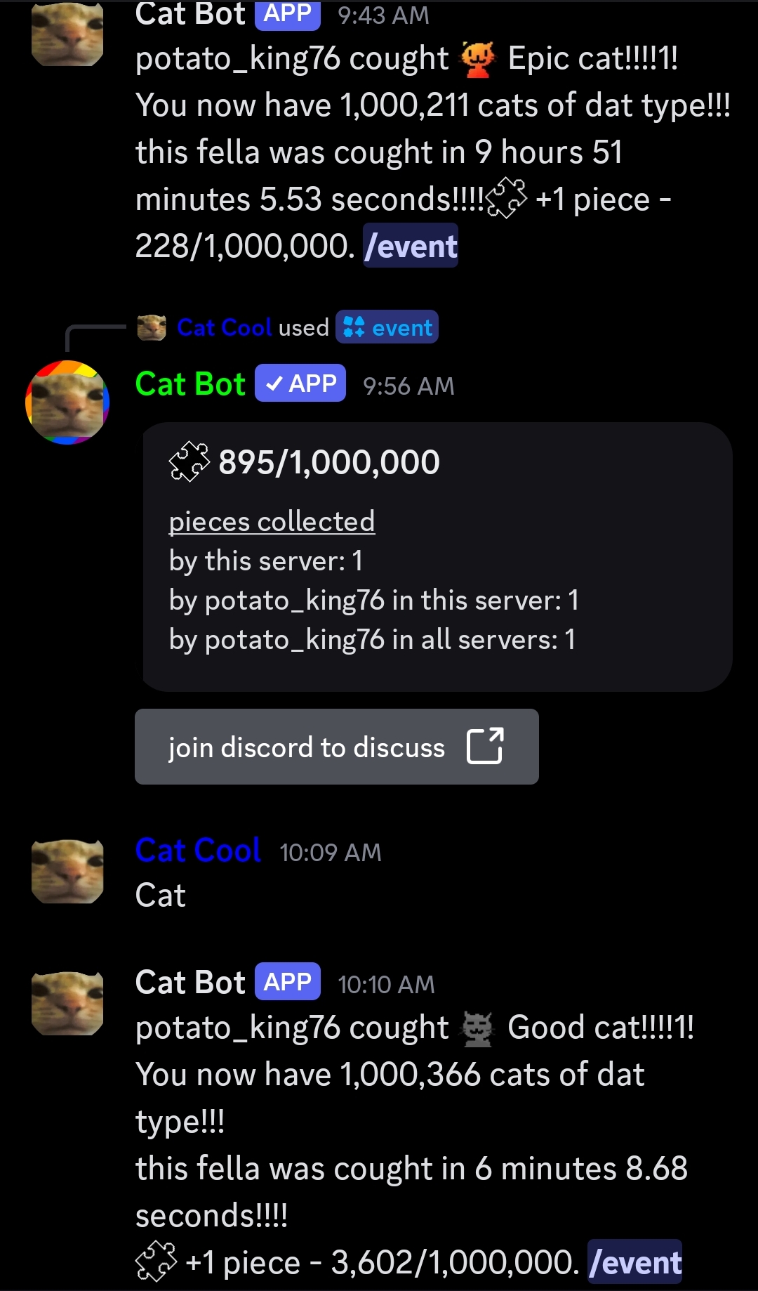 In 2025, a Cat Piece goal. Every time you cought a cat, you contributed to the goal of 1,000,000 pieces. You could view your progress, both server-wide and global, the server progress, the global progress, and a button to join Cat Stand in the temporary /event
