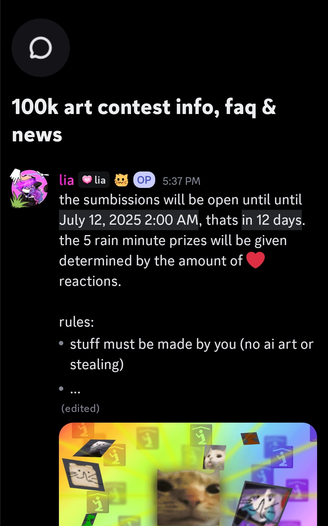 Again in Cat Stand a channel called "#100k-art-contest" was opened for art submissions.