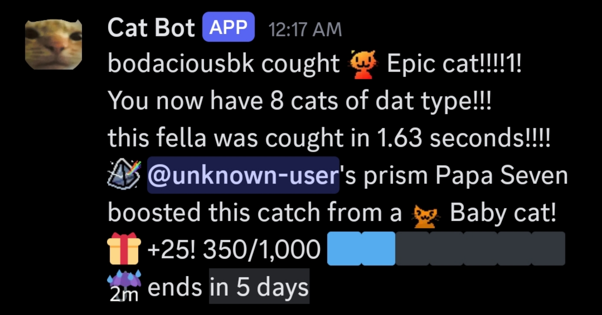 On the day when Cat Bot hit 100,000 servers (June 29th 2025, 11:00 EST), Lia gave away a lot of rain in various ways: