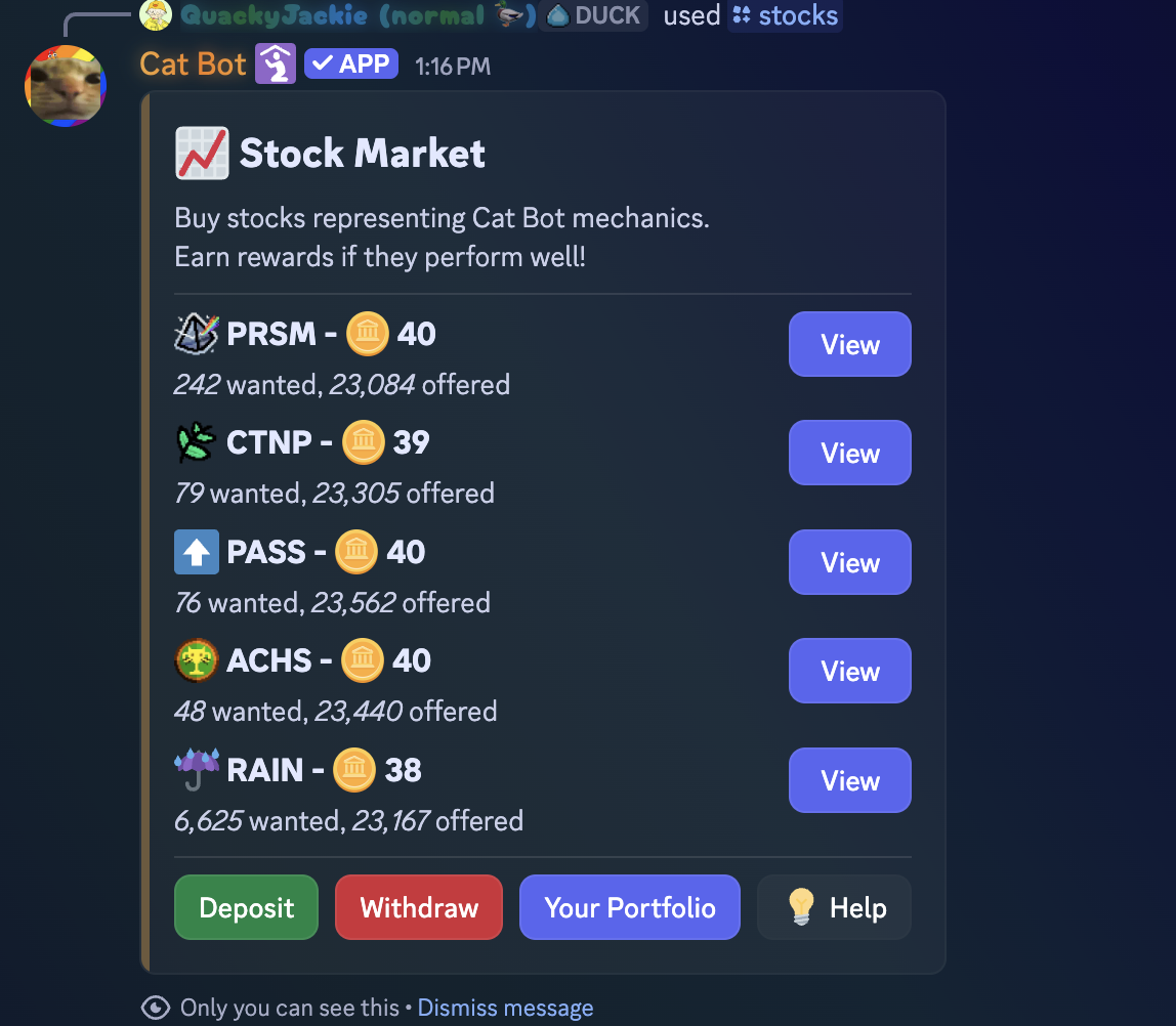 Cat Bot's Stock Market is a recreation of real life stock market made to be as simple as possible while still being functional. There are 5 stocks you can trade with other Cat Bot users globally. To sell and buy stocks you use coins, which you can get by depositing Packs. You can withdraw coins back into Packs with a 25% fee.